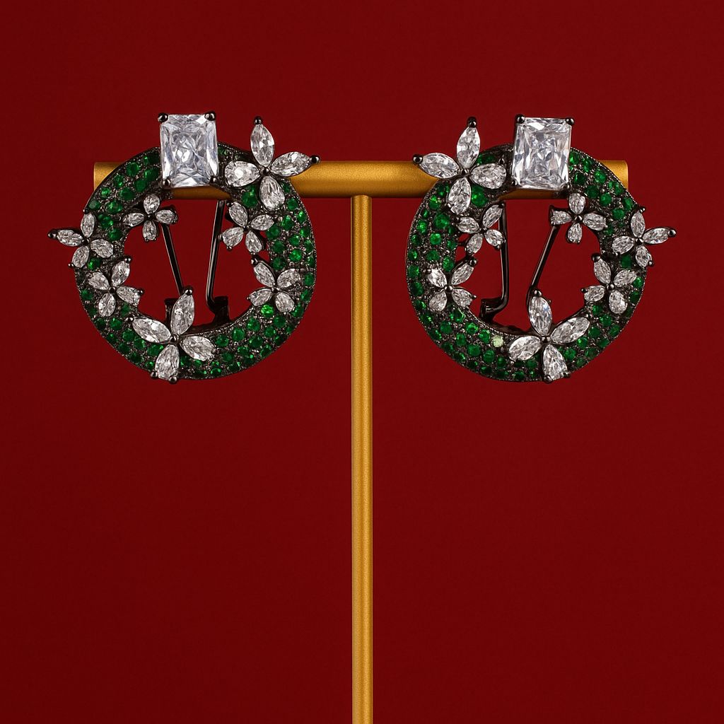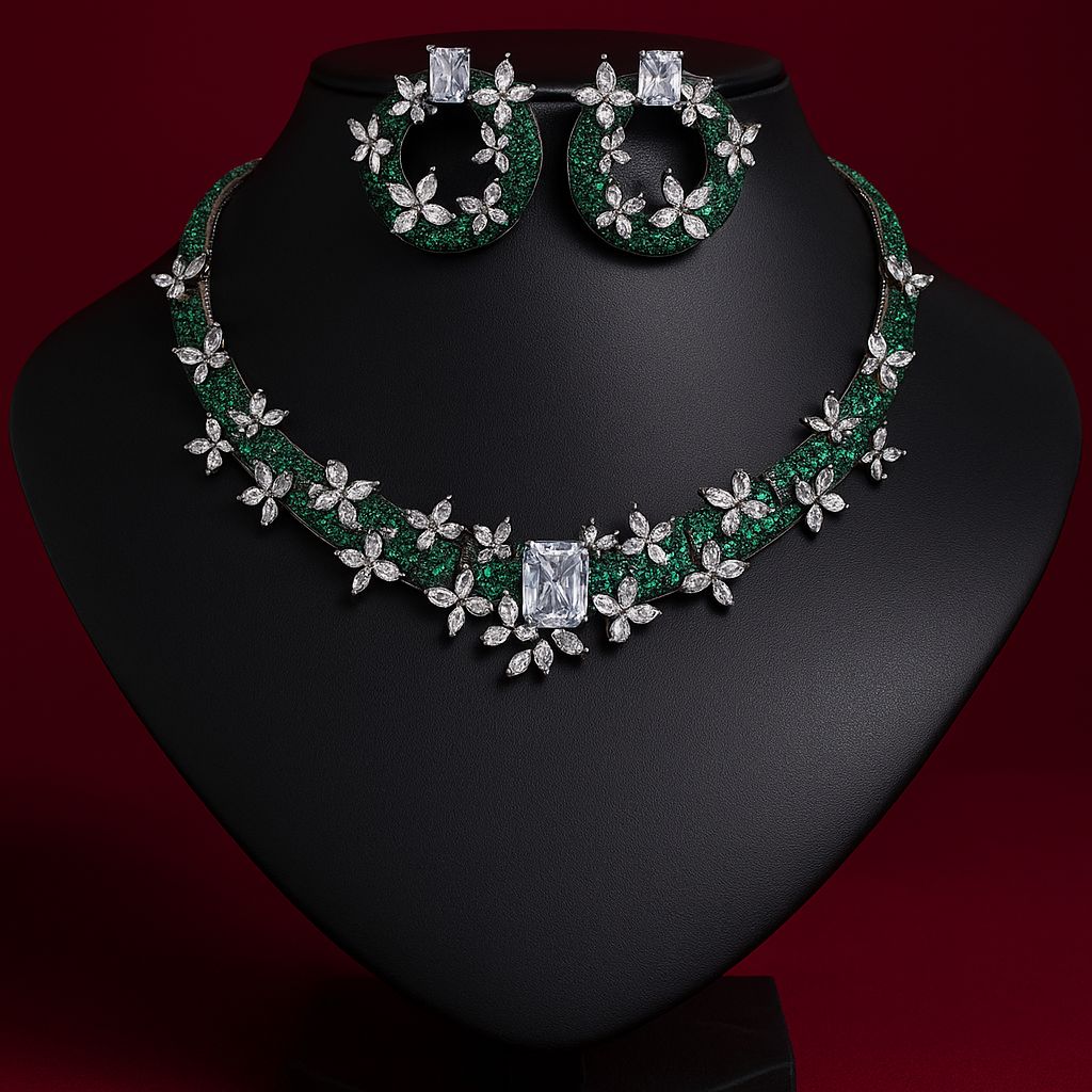 A radiant blend of lush emerlad shimmer and delicate floral stones.