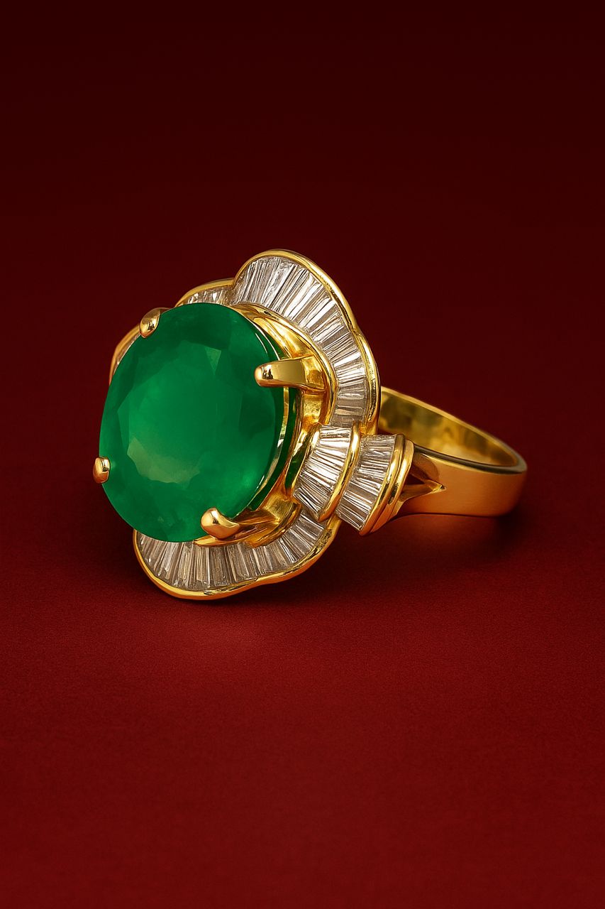 Centered around a lush green genstone framed by shimmering baguette details.